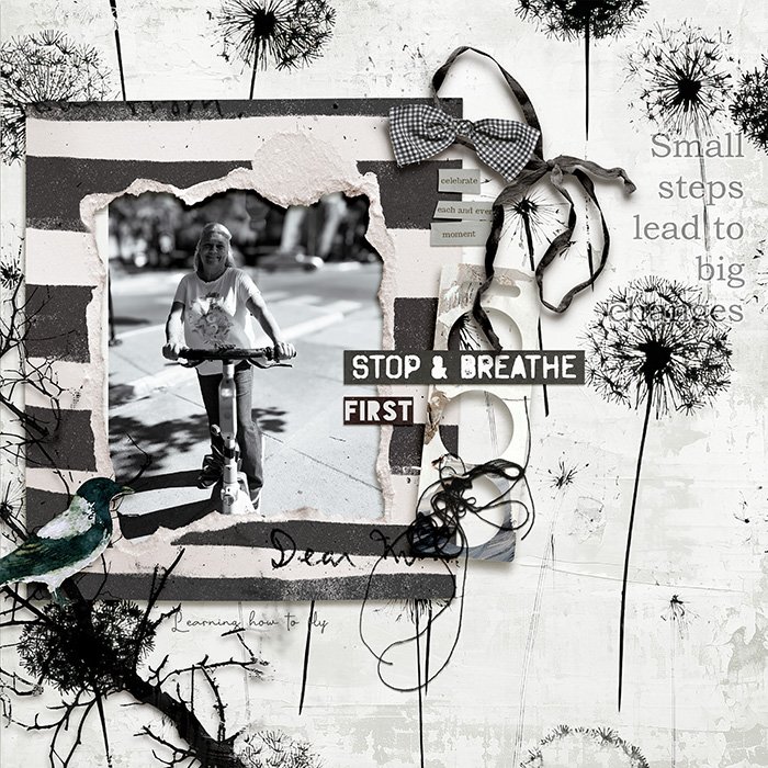 I love the black and white composition of this page – it exudes confidence and determination! The grunge, threads and torn edges make me really stop and examine all the little details. It is both soothingly monochromatic and yet bold at the same time, kind of a portrayal of a quiet, inner spoken, innate perseverance toward a goal, and the resulting explosion of success with bold confidence. And, there’s a bird on it!