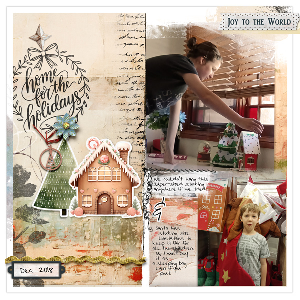What a delightful border with the branches, flowers, stars and other Christmas elements. Love the Christmas tree with the presents and tiny house. The title is perfect! Thanks for playing along in the challenge.Here's my layout for this challenge to create a border: