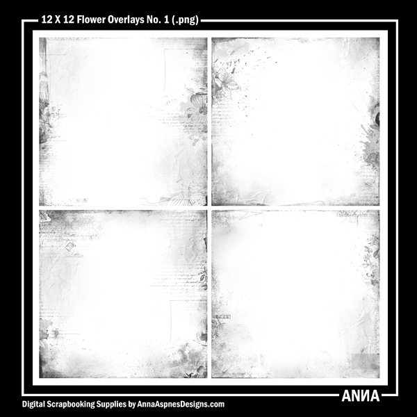 A collection of 4 – 12 X 12 textured overlays delivered in grey .png format. Guidance on using my designs in Photoshop and Elements can be found in the Instructions for Use eBooklet which is available as a free download from the store.