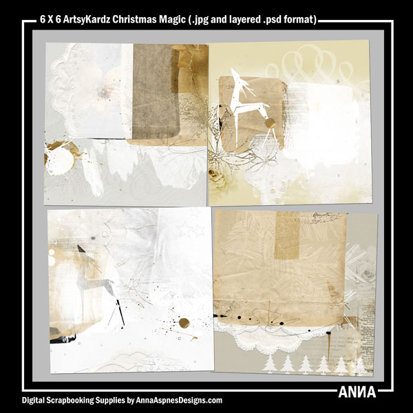 A collection of 4 - 6 X 6 inch Artsy cards delivered in both .jpg and layered .psd format designed for use by both digital and hybrid scrapbookers. Use them for journaling, clip a photo to them, move and modify each of the included layers and experiment with blending modes. These cards can also be easily resized as desired. A technique guide for using my designs can be found in the Instructions for Use eBooklet which is available as a free download from the FreeART category of my store.