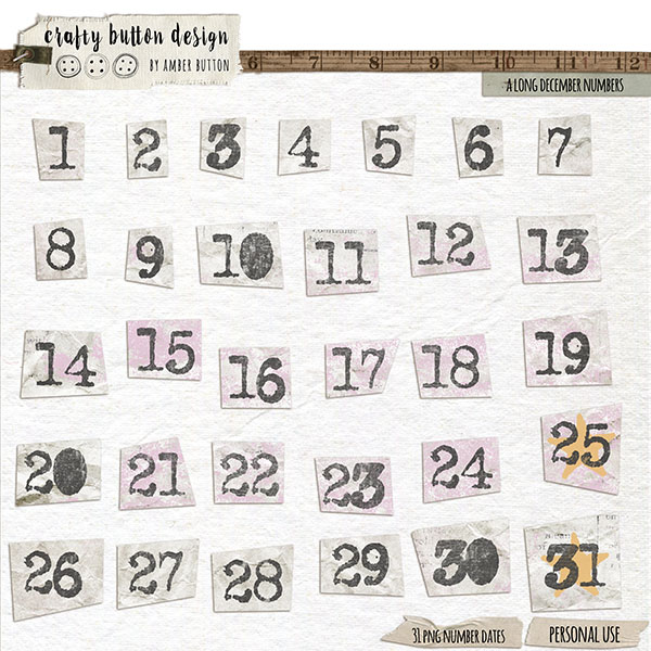 Included are 31 individual dates/numbers in png format, each roughly 1in square. There are stars on 25 and 31 to represent Christmas and New years but since there are 31, they can be used for any month for digital calendars and planners. Or use them as mixed media art fodder.They are pictured in their actual size as compared to a 12x12in background.