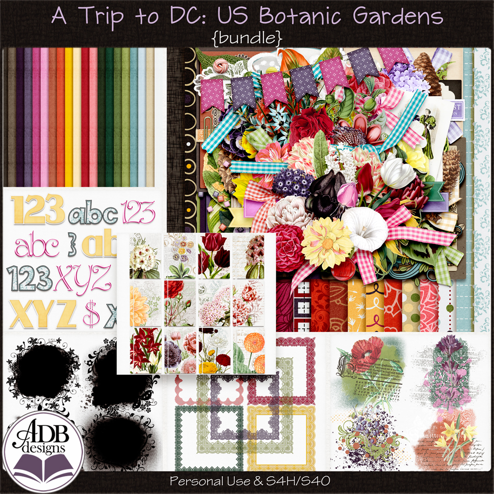 A Trip to DC: United States Botanic Garden is the second in the ADB Design’s series dedicated to the wonderful attractions at the U.S. capital. This collection is full of flowers and foliage you can find at the Botanic Garden in Washington D.C. plus all the necessary extras to create marvelous scrapbook pages.