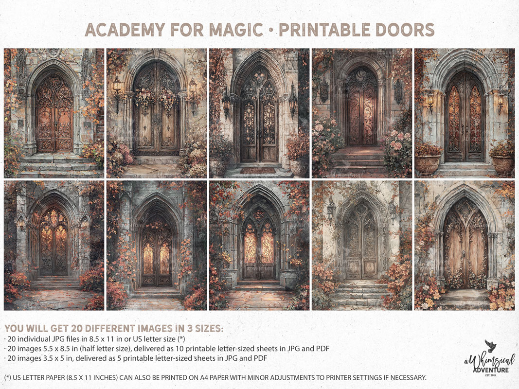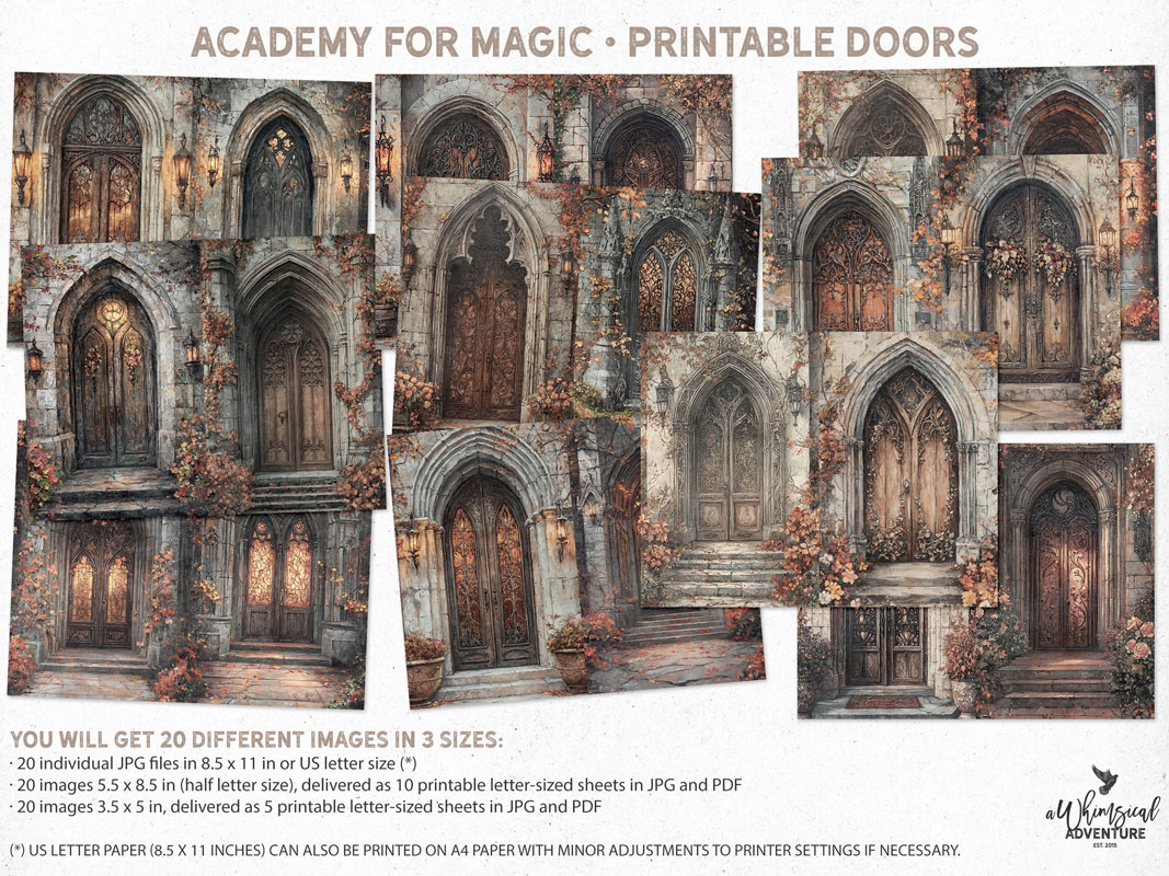 Printable Doors: 20 different door designs, available in 3 sizes: 20 JPG files in letter size (8.5 x 11 in), in half letter size (5.5 x 8.5 inches, delivered as 10 letter-sized sheets with two doors on each sheet), 3.5 x 5 in (delivered as letter-sized sheets with four doors on each sheet - 5 sheets in total).