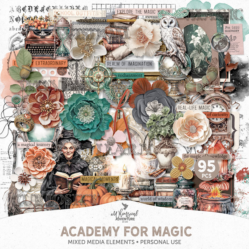 Mixed Media Elements: 95 PNG files, including 2 acorns, 2 bookstacks, a branch, a broom, 3 buttons, a candle, a bubbling cauldron, a cup of hot chocolate, a piece of crochet, a crystal, a crystal ball, an energy burst, 10 pieces of ephemera, a piece of fabric, 10 flowers, 2 frames, glasses, an hourglass, a jar with magical ingredients, 2 vintage labels, 4 pieces of foliage, a magical clock, a magical compass, a magical key and lock, a magical mirror (and then the magical mirror with the frame only), two magical plants, a magical portal, a magical ring, a magical scroll, a magical wand, a night sky, an owl, 3 paint splats, pumpkins, 1 reinforcers strip, 2 ribbons, 5 stamps, staples, 1 stitching, 1 image of a teacher-witch holding a book, 1 messy thread, 1 typewriter, 1 wax seal, 5 pieces of word art, 10 word strips.
