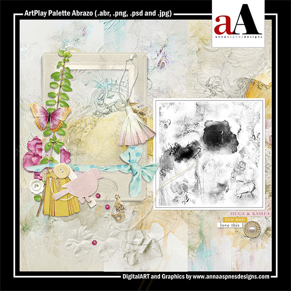Shine a little light on the humble hug. This ArtPlay Palette includes 9 artsy and solid 12 X 12 background papers, a 16-piece BrushSet, 12 transfers/overlays and 16 dimensional embellishments delivered in .psd and .png format to allow for maximum customization where appropriate. Please download the free Instructions for Use eBooklet from the FreeART category in my store for more information on using my various designs in Photoshop and Elements and check out the videos on the aA Youtube channel.