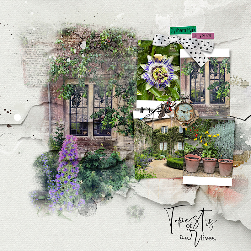 A landscape fabric collage-themed digital scrapbooking and photo artistry collection with stitching and textiles in a jewel-toned colorful palette.