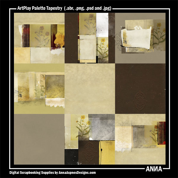 This ArtPlay Palette includes 9 Artsy and solid 12 X 12 background papers, a 12-piece BrushSet, and a variety of dimensional embellishments, transfers, overlays and WordART elements. Please download the free Instructions for Use eBooklet from the FreeART category in my store for more information on using my various designs in Photoshop and Elements