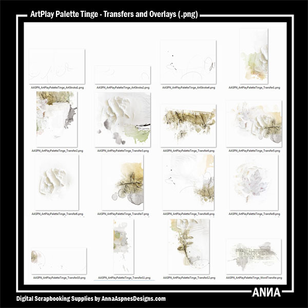 A collection of 16 assorted ArtStrokes, overlays and transfers delivered in .png format. These digital transfers are designed to coordinate with ArtPlay Palette Tinge Paperie, ArtPlay Palette Tinge Transfers and ArtPlay Palette Tinge BrushSet. Please download the free Instructions for Use eBooklet from the FreeART category in my store for more information on using my various designs in Photoshop and Elements.