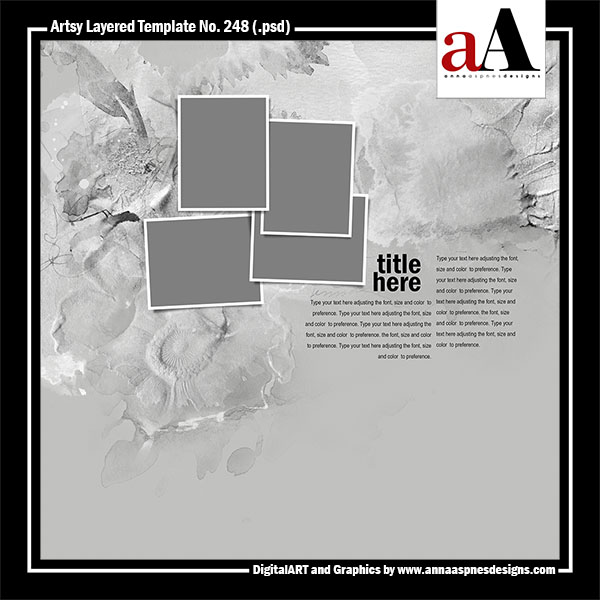 A 12 X 12 artsy layered template featuring numerous masks designed for use with the clipping mask function or for recoloring in Photoshop, Elements and Paint Shop Pro. All layer styles, masks, frames, brushwork, title and textboxes shown are included. Simply clip your images to the FotoBlendz masks and add your own words. Further information on using clipping masks in Photoshop and Elements can be found in the Instructions for Use eBooklet which is available as a free download from the FreeART category of my store and in the videos on the aA Youtube channel. Suitable for at least 5 photos.