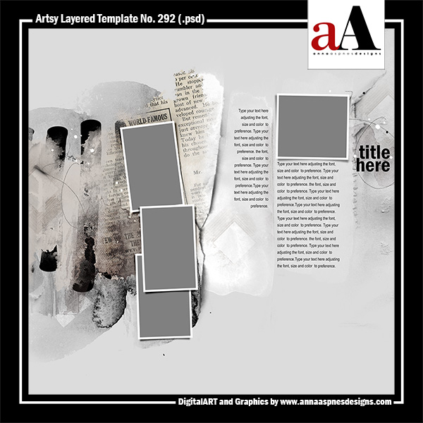 A 12 X 12 artsy layered template featuring numerous masks designed for use with the clipping mask function or for recoloring in Photoshop, Elements and Paint Shop Pro. All layer styles, masks, frames, brushwork, title and textboxes shown are included. Simply clip your images to the FotoBlendz masks and add your own words. Further information on using clipping masks in Photoshop and Elements can be found in the Instructions for Use eBooklet which is available as a free download from the FreeART category of my store and in the videos on the aA Youtube channel. Supports at least 4 photos.