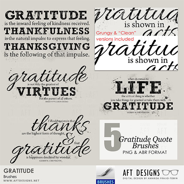 • (5) Quote stamps about Gratitude. Come with 2 versions, "clean" and a distressed version. Includes PNG and Photoshop ABR format.