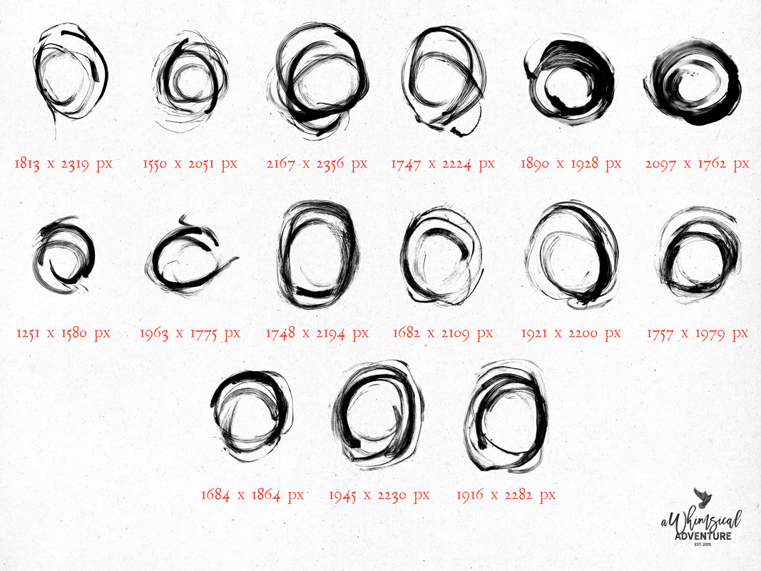 This set includes fifteen black paint circles with a grunge edge. Use them to frame a photo or journaling spot, stamp them behind elements for a layered look, or overlap several rings to create dynamic focal points. They can add structure to abstract pages, bring energy into otherwise plain backgrounds, or work as subtle textures when blended into papers. Recolor, resize, and combine them with other brushes to create anything from bold graphic accents to faint, worn imprints.