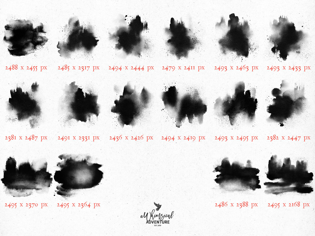 These diffuse black stains bring that effortless “inky-but-not-too-inky” mood designers reach for on days when their pages need movement without shouting for attention. The set includes soft bleeds, scattered speckles and drifting washes — the kind that slide beautifully into mixed media papers, art journaling elements and layered textures.