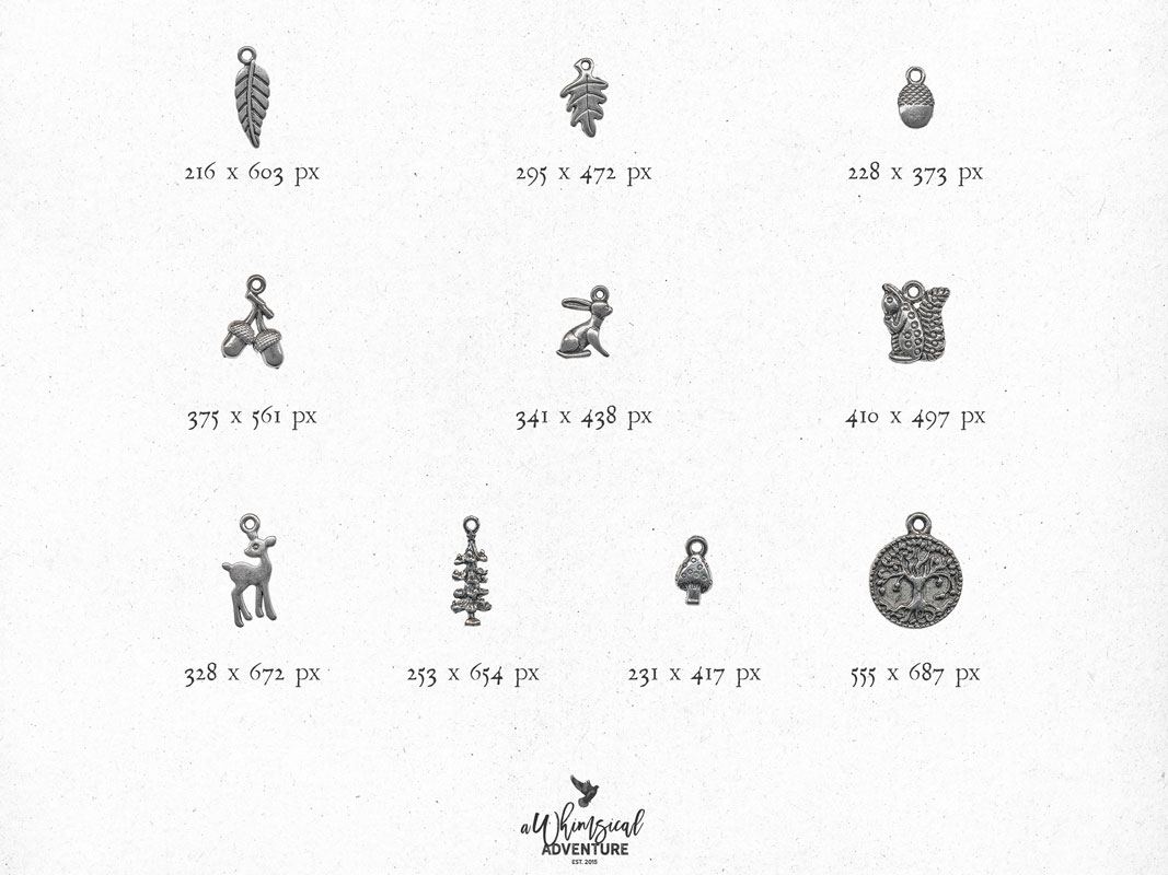 This pack includes 10 realistic silver woodland charms with a detailed, slightly aged metal texture. Perfect for autumn or woodland-themed projects, these digital charms can be used as decorative elements in your scrapbook layouts, digital kits, and other creative projects where you want to add a touch of nature and subtle shine.