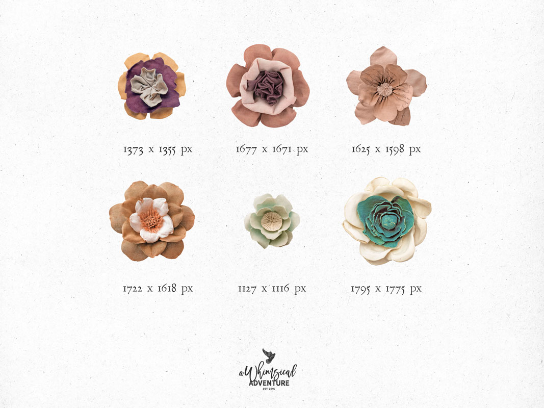 Styles: fabric-inspired florals, paper-like blossoms, soft handcrafted feel, delicate layered petals