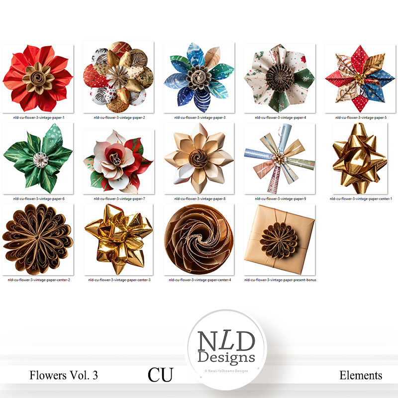 CU Flowers Vol.3 is a pack of paper flowers made from vintage wrapping papers perfect for your scrapbooking projects.