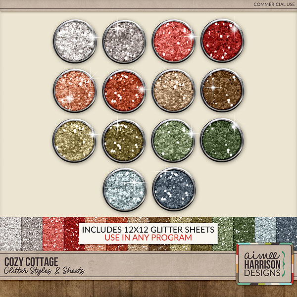 - 14 12x12 glitter sheets, 1 .pat file, 1 .asl file and 2 .xml files for Adobe Elements users.