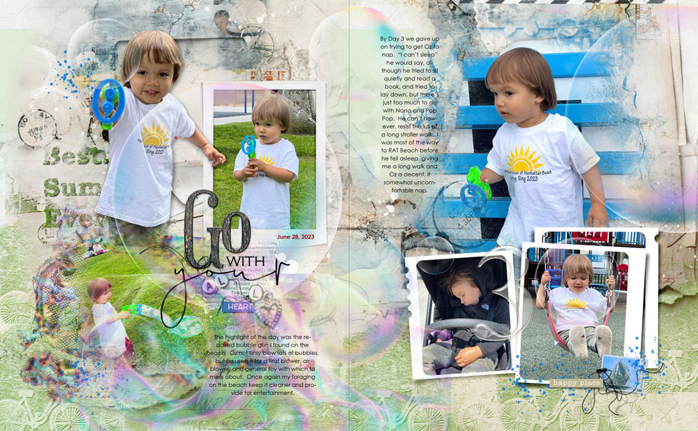 A 12 X 12 whimsical travel-themed layered template with an eclectic palette for digital scrapbooking, photography, photo books and collage art: