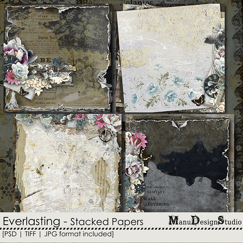 This set contains 4 Premade Scrapbook Layouts, Stacked Papers.