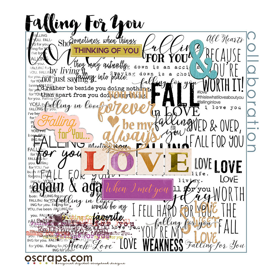 As the days wane, the trees don their vibrant hues of scarlet and gold. The air is filled with an earthen aroma and leaves swirl to the ground. Never wish the Fall away, savour and delight in it! Whether you're Falling in love or just love Fall itself, the talented Oscraps designers have created the perfect kit to document it. Featuring gorgeous papers and elements in the rich and varied tones of autumn, and word art just right for any type of "Fall" you're scrapping, we know you will be head over heels for this stunning collaboration!