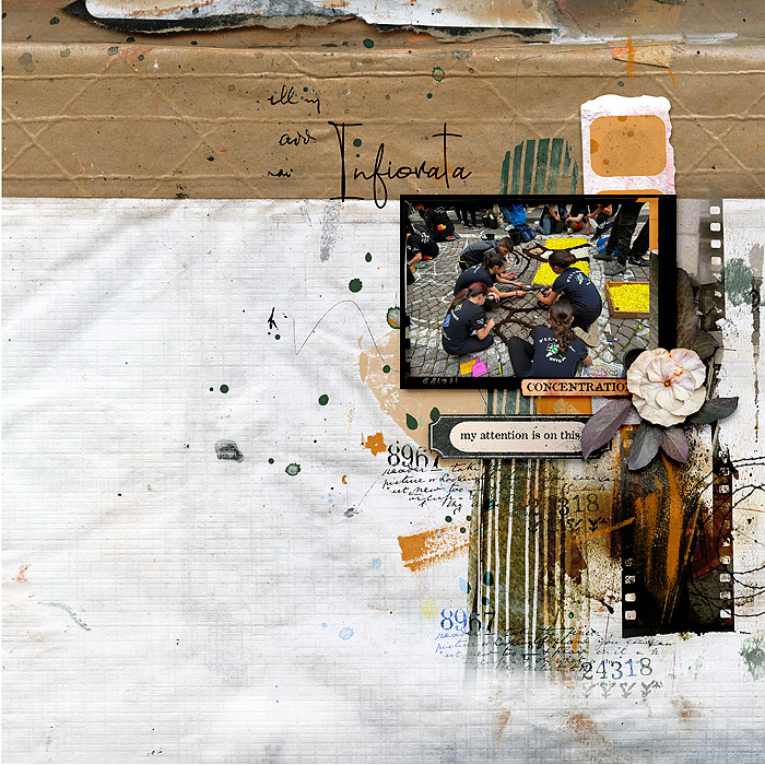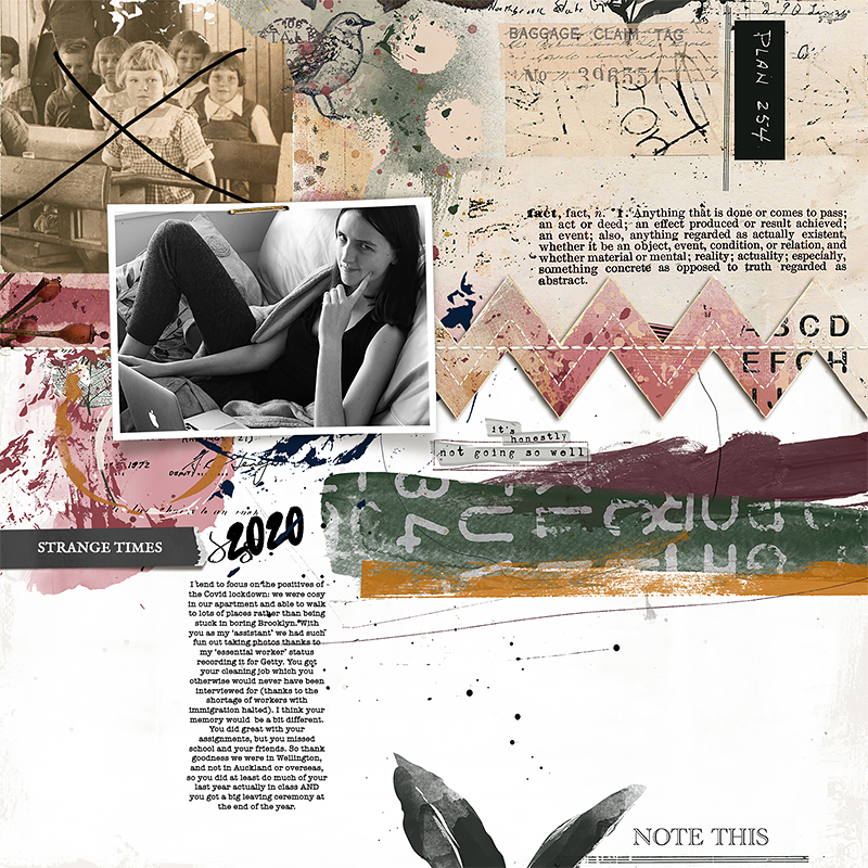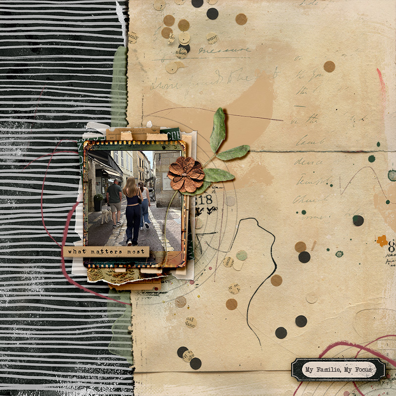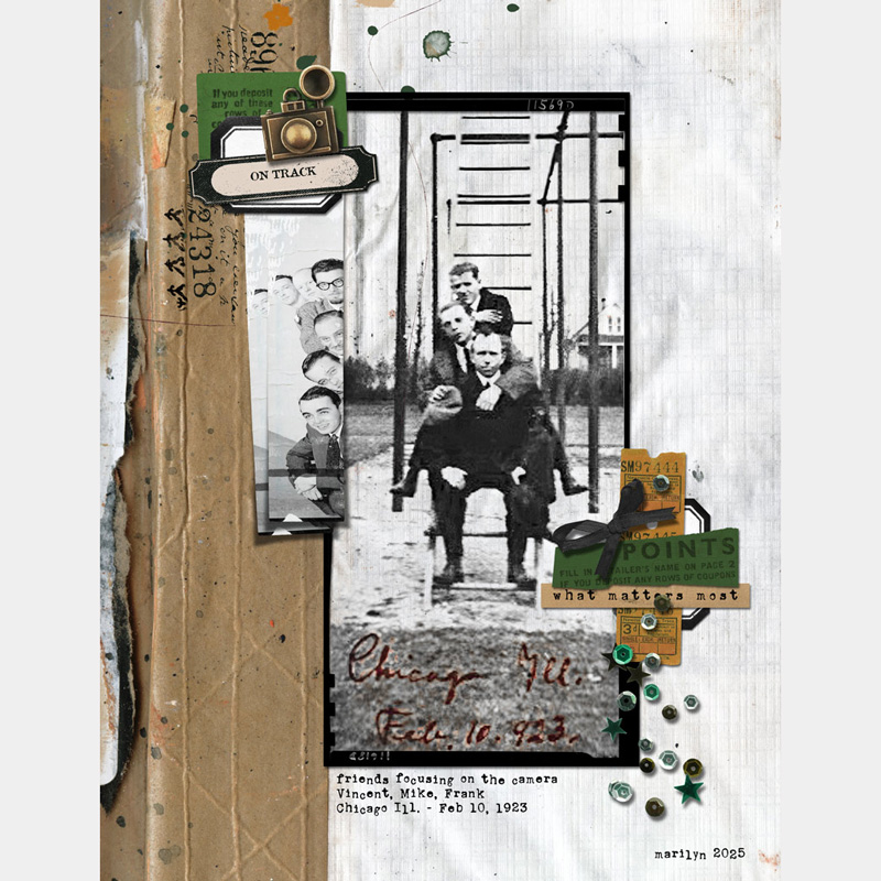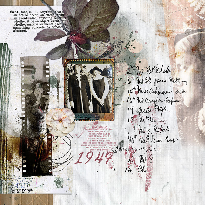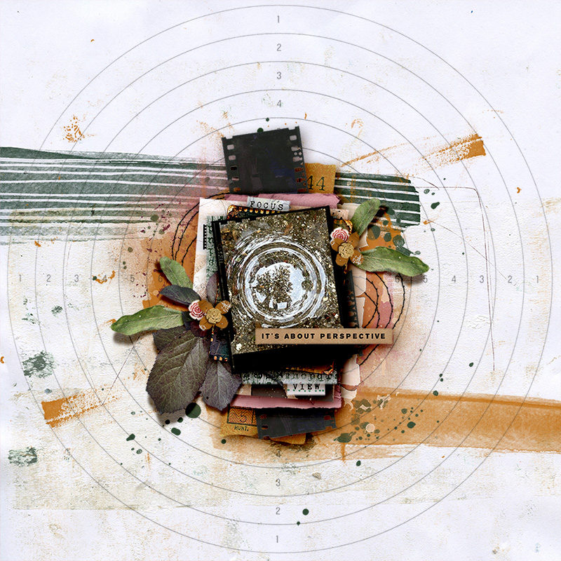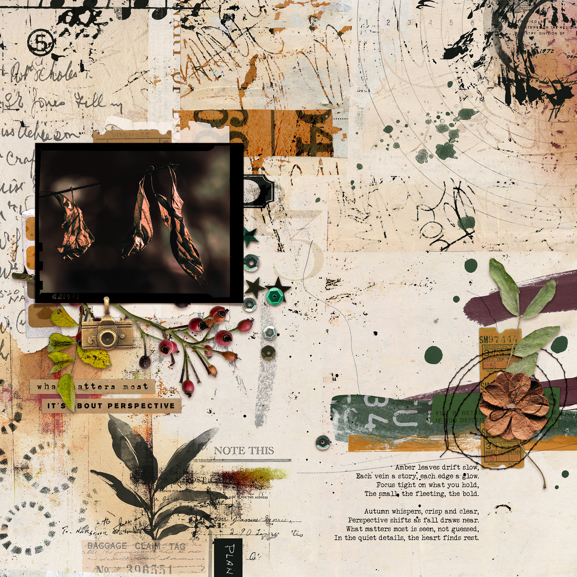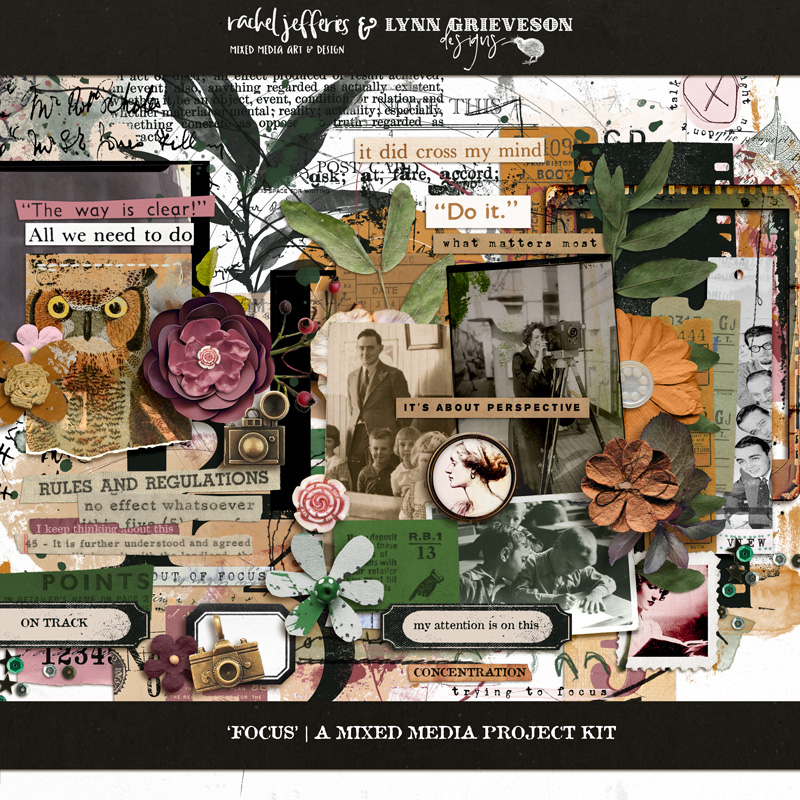 Detailed Element List: Berries, blank journal strips, button, multi media collage including text fragments, old paper and botanical stamp, messy doodles, assorted flowers, frame, foliage leaves, typography numeral stamp, image transfer and overlay style paints, various word strips and journaling prompts covering themes such as attention, being on track, concentration, things on our minds, positive affirmations, perspectives and epiphanies, postage stamp with female portrait reading a book, tags with vintage female portrait, numeral tags, tape, text fragment stamps, torn owl paper, vellum piece, vintage school photos, out of focus blurry photo, bow, camera trinkets, genuine vintage ephemera travel tickets and ticket stubs, messy stamped frames, messy threads and stitches, painty film strip, paint splatters, old photo of vintage woman with a camera, paper bits, sequin scatter, paint swatches, tag featuring male figures, target, texture paints.
