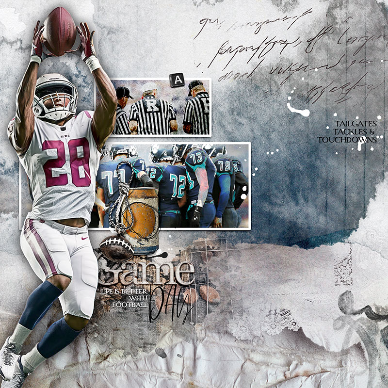 Dimensional elements/embellishments include orange oak leaf and twig, soda/beer can and bottle tops, football, player, ‘I love Football’ and helmet metal charms, blue button, pizza slice, black and white shoelace tie/loops, UrbanThreadz stitching and paint splatters