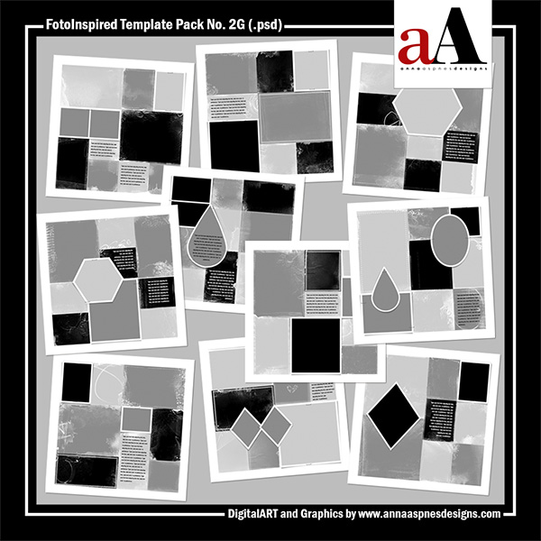 Ten 12 X 12 Artsy MultiFoto layered templates delivered in layered .psd format to include a number of distressed FotoMasks, 3-layer frames, stitched frames, and staples. The templates in this pack may be used independently or in pairs to create cohesive double-page spreads which can be resized as desired. This is part of a series of templates that form the foundation of my FotoInspired project.