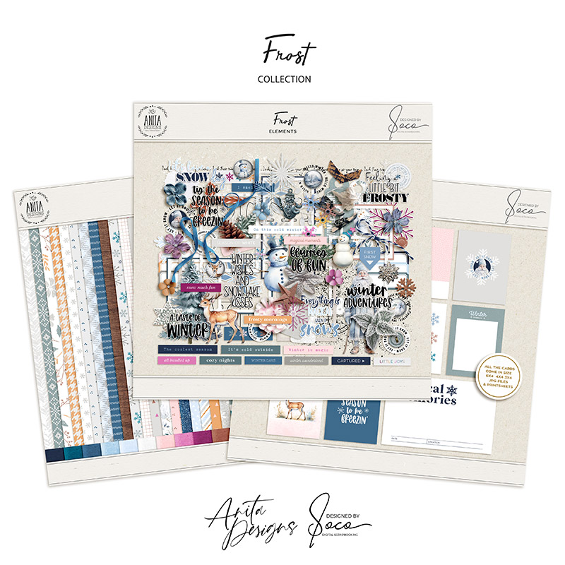 Frost, a Digital scrapbook collection in a winter theme. Meet Jack Frost and his little deer friend and scrap all your winter photo's and frosty winter memories. This kit comes with lots of winter themed papers and elements for you to decorate your beautiful photo's and layouts. The colors are warm brown, three shades of grey, white, soft pink and a touch of yellow and green plus lots of blue and ice tones, even some violet tones to create some popping elements to your page