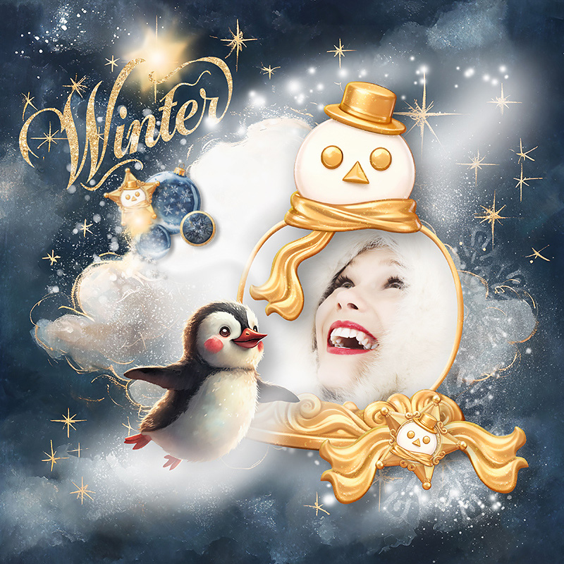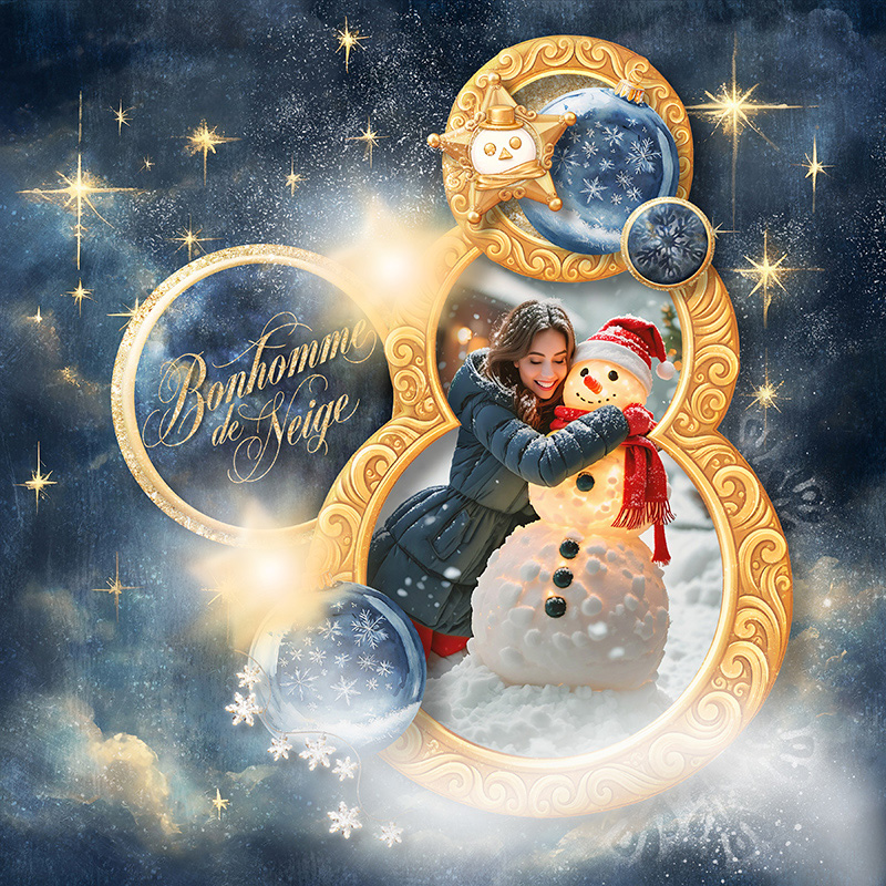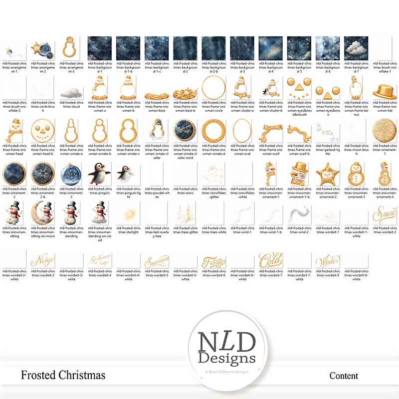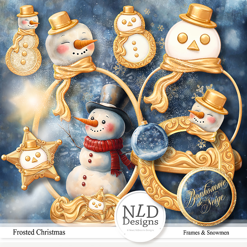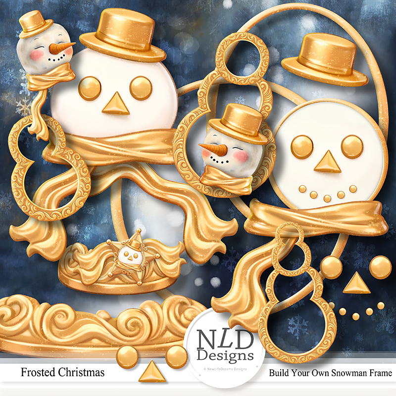 37 unique digital elements with variants for 49 total (Contains separate gold elements so you can create your own snowman frame)