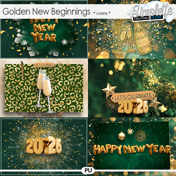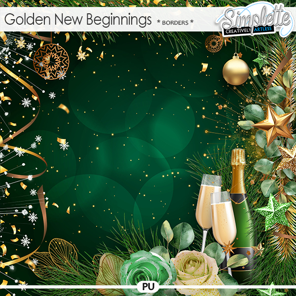Golden New Beginnings is a digital scrapbooking collection inspired by the beauty and elegance of New Year celebrations. Perfect for New Year layouts, greeting cards, winter projects, and celebrating fresh starts, it features a refined color palette of deep greens, soft gold, and champagne tones, enhanced with delicate flowers and subtle foliage.