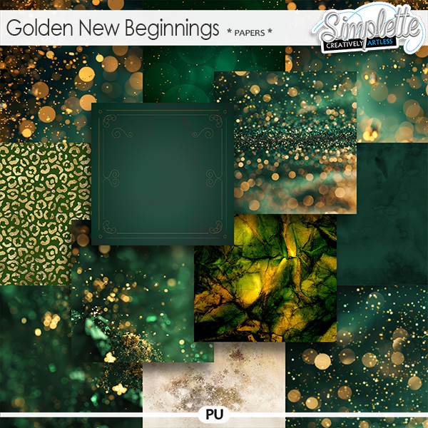 Golden New Beginnings is a digital scrapbooking collection inspired by the beauty and elegance of New Year celebrations. Perfect for New Year layouts, greeting cards, winter projects, and celebrating fresh starts, it features a refined color palette of deep greens, soft gold, and champagne tones, enhanced with delicate flowers and subtle foliage.