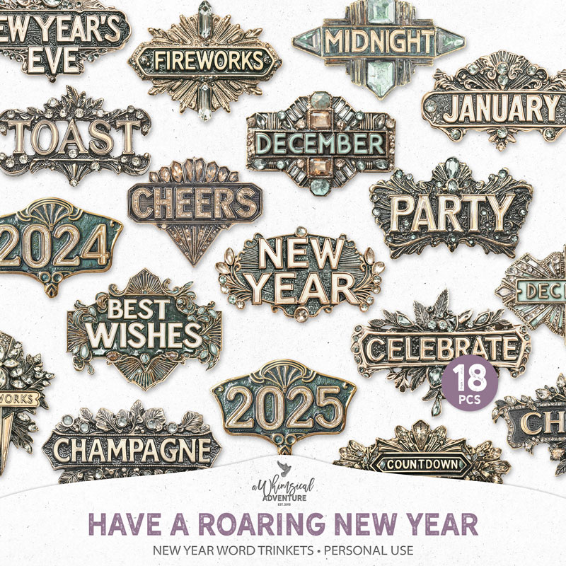 A sophisticated collection of Art Deco-inspired elements. With authentic Barbier fashion plate cutouts, opulent floral designs, dazzling word trinkets and a set of firework stamps and Art Deco-style overlays, this pack celebrates the elegance of the Jazz Age. Perfect for crafting holiday cards, creating digital collages, or adding glamour to festive journal spreads, these elements bring vintage charm to your New Year-themed projects.