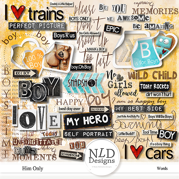 The Him Only collection by NLD Designs includes an assortment of papers and elements to help you create create Boys,Masculine & Children themed scrapbook pages and printable art projects.