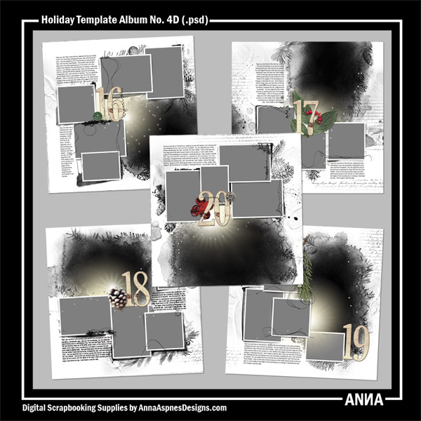 A set of 12 X 12 Christmas/Holiday-themed Artsy layered templates designed to create pages 16-20 of a 31-page photobook or album. This is Part 4 of 6 in this series and the templates are intended for use with the clipping mask function or for recoloring in Photoshop, Elements and Paint Shop Pro. All layer styles, masks, frames, brushwork, stitching, elements, title and textboxes shown are included. Simply clip your images to the FotoBlendz masks and add your own words. Guidance on the use of clipping masks and recoloring in Photoshop and Elements can be found in the Instructions for Use eBooklet which is available as a free download from the store or view this video.