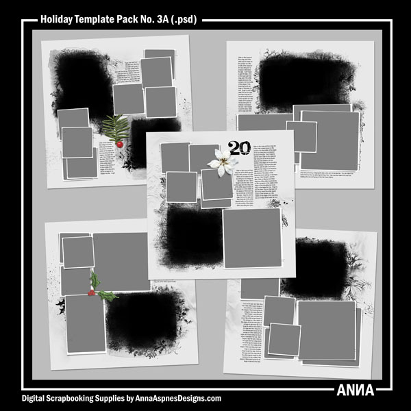 Five 12 X 12 MultiFoto layered templates delivered in layered .psd format to include evergreen FotoBlendz clipping masks, Holiday-themed elements, 3-layer frames, texture, paint and textboxes. These templates may be used independently or form 2 cohesive double-page spreads which can be re-sized as desired. This template pack provides pages 1 through 5 of this template album. Please download the free Instructions for Use eBooklet from the FreeART category of my store for guidance on using clipping masks and recoloring in Photoshop and Elements.