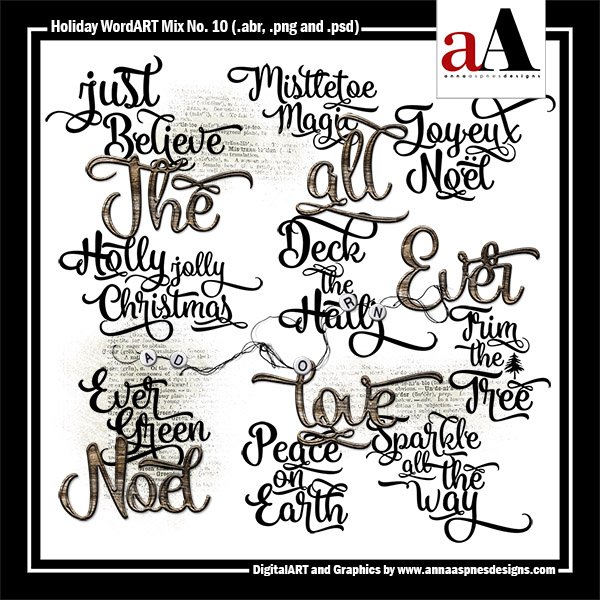 A collection of 18 varied, Holiday-related WordART elements which include 5 WoodWords, 9 WordART quotes/titles, 3 WordTransfers and 1 BeadedThreadz designed to be mixed and matched to create custom WordART titles. I've also included the WordART and WordTransfers designs in brush .abr format. Files are delivered in .png format unless otherwise noted. Guidance on the use of my designs in Photoshop and Elements can be found in the Instructions for Use eBooklet which is available as a free download from the store and in the videos on the aA Youtube channel.