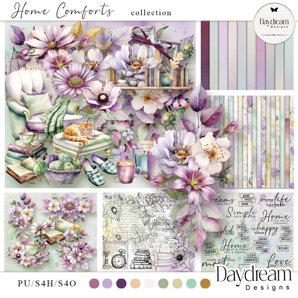 The "Home Comforts Collection celebrates the little things that make life beautiful. It is a gentle reminder of the home's cosy, serene, and nurturing atmosphere, a place to cherish family moments and the small joys that make a house a special place, A retreat from the world and a place where our most cherished memories are made.The Home Comforts digital scrapbook series includes plenty of flowers, foliage, and coordinating papers. It is also suited for cards, invitations and gift tags and is perfect for incorporating into your digital art pages or journals.