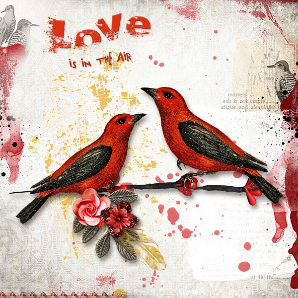 Detailed Elements list: 5 birds, 1 branch, 2 buttons, 1 doily, 2 flowers, 2 frames, 2 labels, 1 lace, 1 leaf, 1 mask, 1 overlay, 3 paint, 4 papers, 2 stamps, 1 stitch, 3 tickets