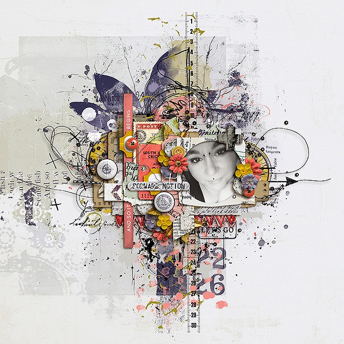 an element collection including assorted flowers, assorted foliage, titles, assorted phrase and journaling elements, threads, fabric banner, buttons, epoxies, frames, faux postage, ripped map pieces, butterfly, lace, sequins, tickets, pennyfarthing bicycle and more