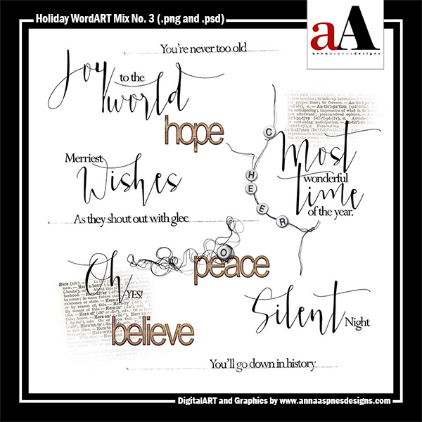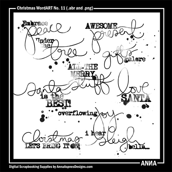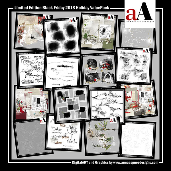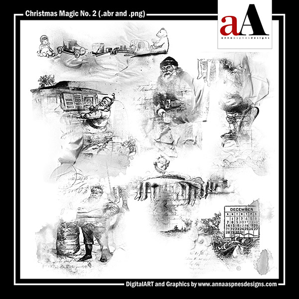 This Limited Edition collection of aA DigitalART includes some of the Creative Team Members' favorites for holiday projects and cards. The supplies are delivered in a variety of file formats to include .abr, .png, .psd and .jpg and are designed for use in photo-editing software programs such as Adobe Photoshop and Elements.