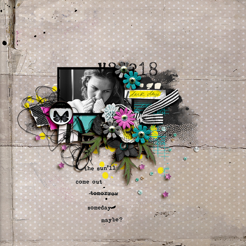Detailed Element list: 10 assorted paper and painted clouds, 7 assorted flowers, 3 assorted buttons, 2 pins/brads, doodled border, 2 assorted bows, crochet piece, 2 assorted frames, paper leaf, green leaf, 2 assorted metal findings, a huge assortment of paints, scribbles, messy marks and messy stamps, clustered pins, pinhole overlay, paper rainbows, 19 assorted paper scraps or pieces, sequin and bead scatters, staples, messy stitches and threads, tape, 21 assorted word arts or journaling prompts but blank journaling lines, moth, ink splatters, ribbon, stars and a sunshine.