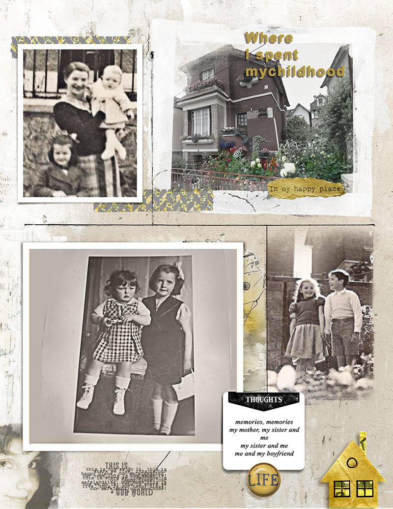 Four layered page templates featuring blended photos, stitched photo spots, paint, gesso and bookplates. Fill all the spots with photos, or mix with journal cards to create a fun pocket scrapbooking layout.
