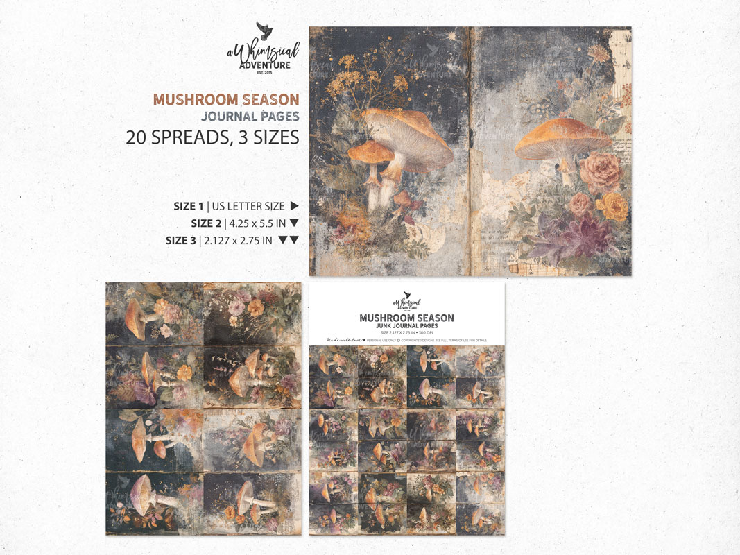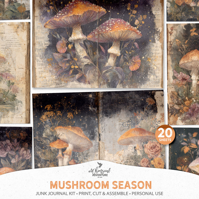 themes: mushrooms, toadstools, woodland, forest floor, nature decay, autumn foliage, earthy textures, organic paper, late-season mood