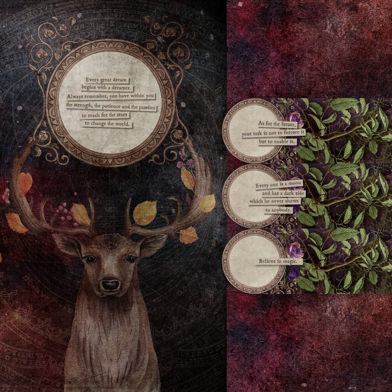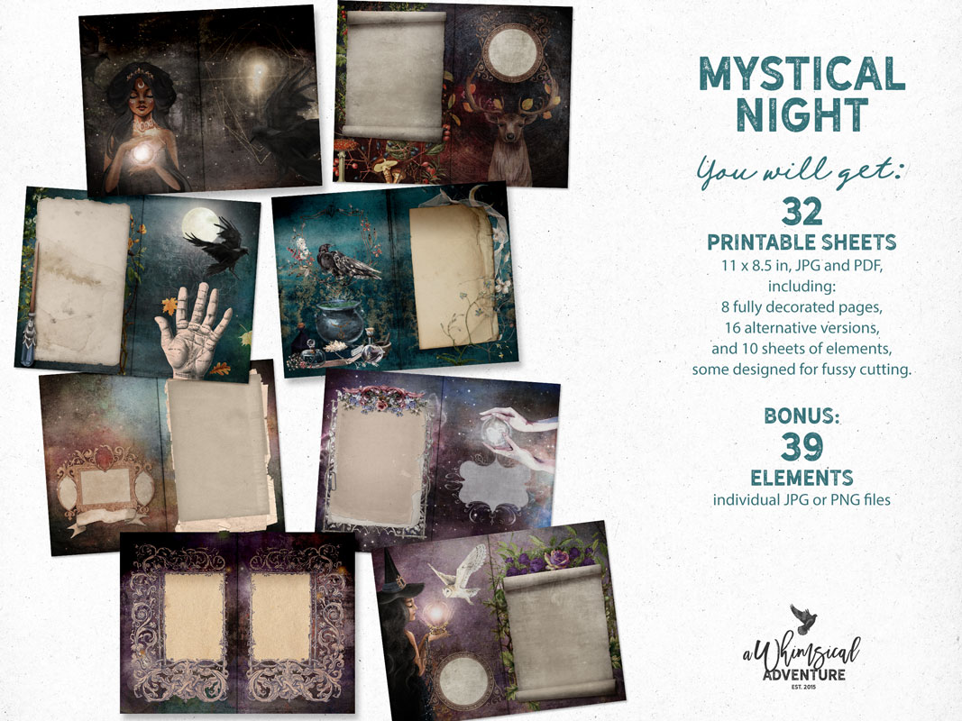 The Mystical Night junk journal kit is filled with darkly enchanting imagery—celestial skies, glowing moons, forest creatures, and vintage botanicals. With its mix of mystical art and atmospheric backgrounds, this printable kit is perfect for scrapbooking, junk journaling, card making, decoupage, art journals, smash books, and many other creative projects.