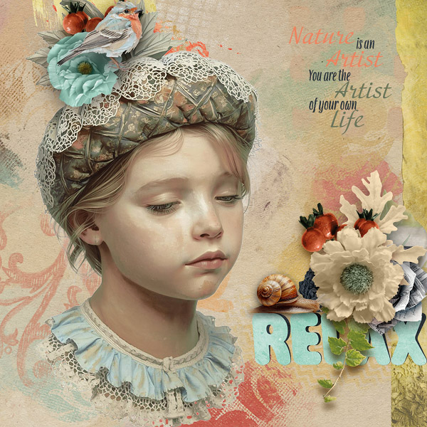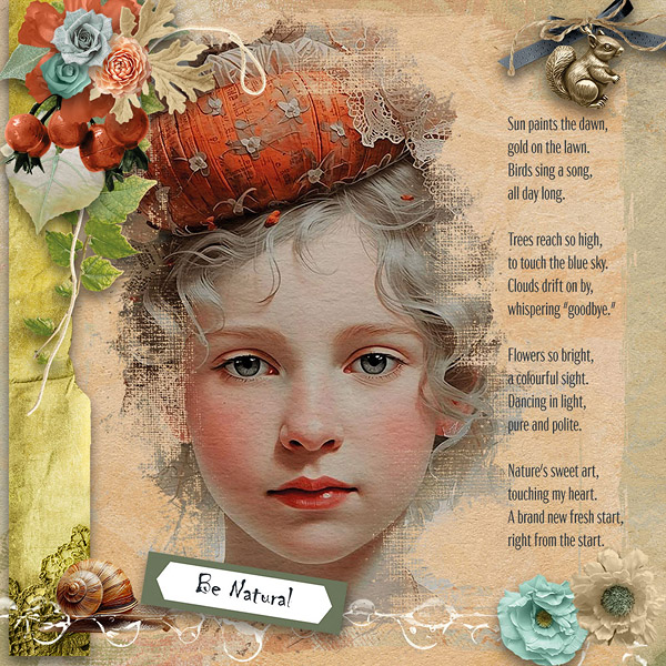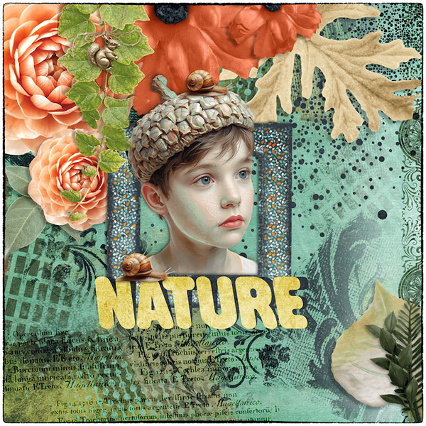This Page Kit is about the art of nature and how you can create your own ( digital) artwork with flowers, leaves, a cute bird, pinecones and look at the cute boy and girl and their hats made of acorns.