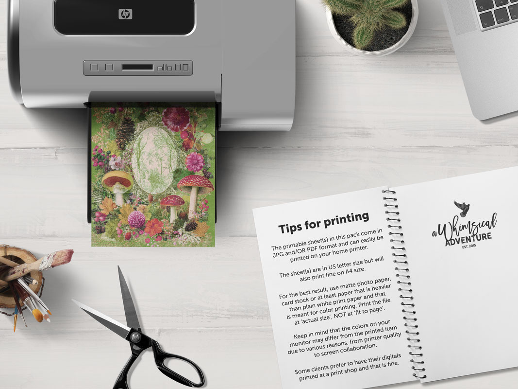 uses: printable journal pages, covers, collage sheets, mixed media layering, nature-inspired storytelling