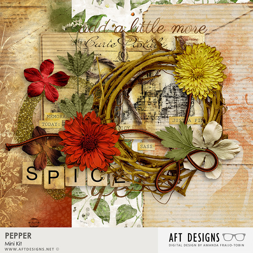 Spice up your layouts with this digital scrapbooking kit inspired by hues of various peppers. Great for fall or other neutral projects. Packed with silk, realistic, and pressed flowers, string, a twisted twig frame, "spicy" word art, and beautiful blended and distressed papers.