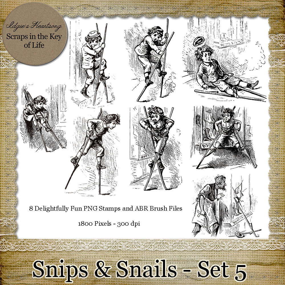 8 More Delightfully Fun Vintage and Highly Detailed SNIPS and SNAILS (Little Boys) PNG Stamps With ABR Brush Files Included. SNIPS and SNAILS and PUPPY DOG TAILS! That is What Little Boys Are Made Of! These Images Are So Delightful - They Make Me Smile Just Looking at Them. I Hope They Do the Same For You! This is Set 5 of 5. Is There Anything Sweeter Than the Innocence of Childhood? I have not attempted to walk on stilts since my early childhood and it certainly was a challenge even then. LOL! Obviously, this young SNIP found it so! Blend these charming images into your papers, make cards or invitations, print out and frame for your walls, decoupage onto furniture! Print out on Water Slide Paper and apply to glass! The possibilities are virtually endless! Sized at 1800 Pixels in the Longest/Widest Direction - 300 dpi Personal or Commercial Use I Hope You Enjoy These Vintage Treasures as Much as I Do! Have Fun! Wishing You All of Life's Sweetest Blessings!
