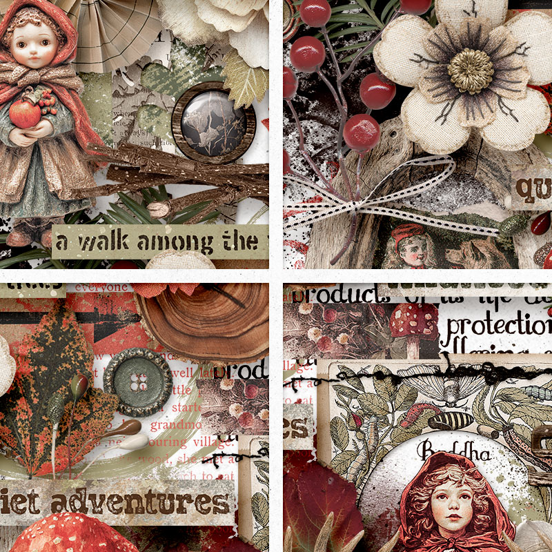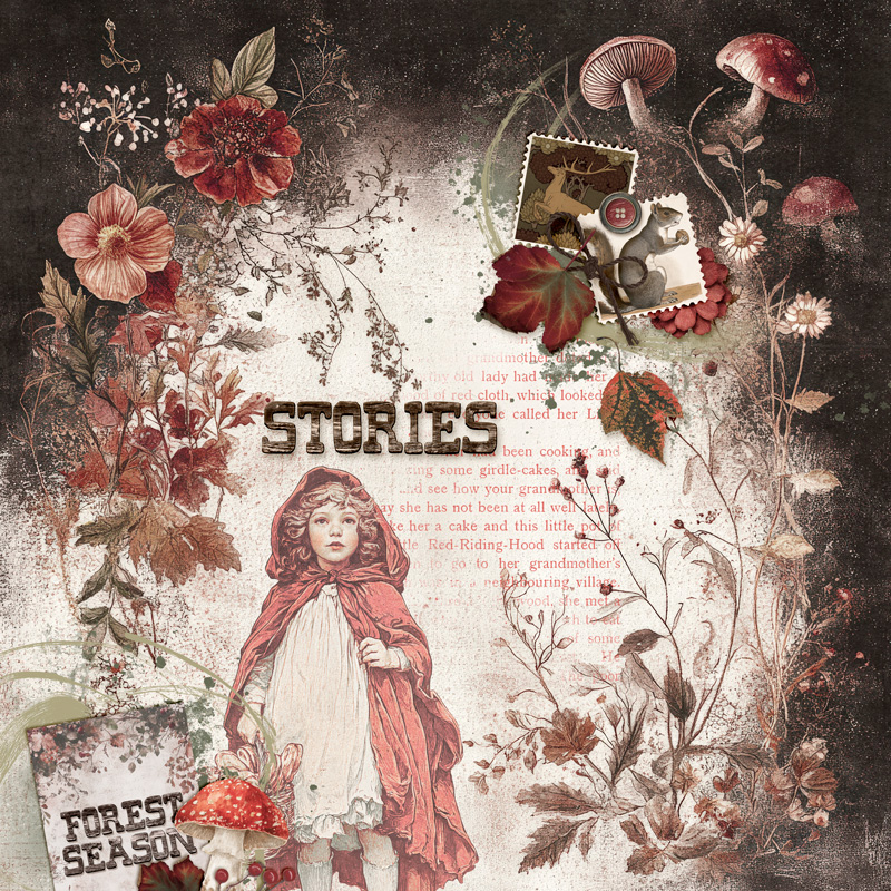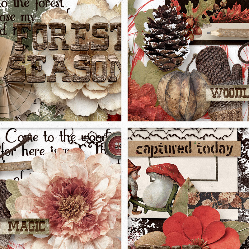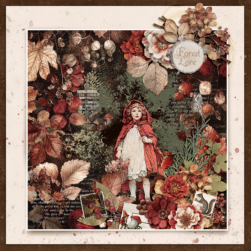 101 elements (PNG), including: antlers, 1 paper arrow, 1 forest basket, berries, 1 pair of rubber boots, 2 brads, 4 buttons, 5 paper ephemera bits, 8 flowers, 3 dried flowers, 1 flower bead, 5 pieces of foliage, 1 frame cluster (PNG and layered TIFF/PSD), 1 wooden frame, 1 vintage paper frame, 1 knitted swatch, 3 leaves, 2 Little Red Riding Hood pieces (1 figurine and 1 paper cutout), 1 millinery flower, 1 pair of mittens, 1 mushroom, 1 owl, 7 paint splats (can also be used as masks), 2 grunge-painted circles, 1 wooden pencil, 2 pinecones, 2 faux postage stamps, 5 quotes, 2 ribbons, 1 seedpod, 1 signpost, 6 stamps, 2 stitchings, 1 string, 1 twig cluster, 2 pieces of washi tape, 1 wolf head, 1 wooden wolf toy, 1 stack of wood logs, 2 wood slices (one with text), 4 large wooden titles, 9 wordstrips.