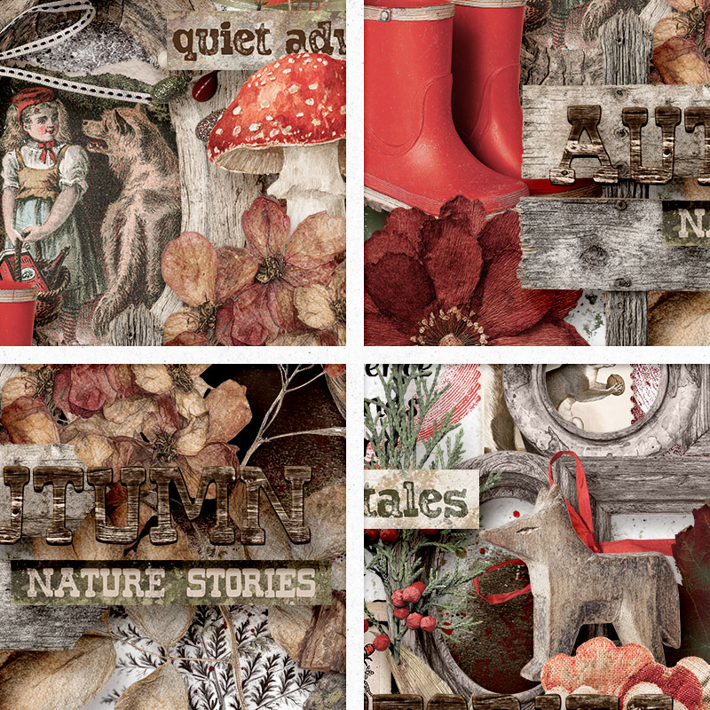 Skogstid is a collection built around the deeper tones and textures of late autumn forests. It mixes muted greens, warm browns and soft reds with worn bark, scattered leaves, earthier surfaces and the quiet tension that settles in the woods as the season turns colder. The mood leans into folklore elements without becoming literal — small hints, subdued colours and subtle shapes that echo the old stories rather than retelling them. You’ll find gentle nods to Little Red Riding Hood, kept understated so the woodland feel stays intact.